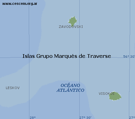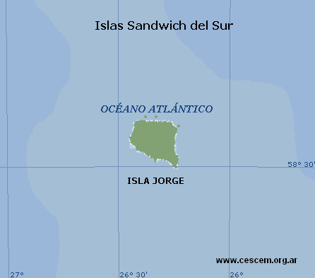 Malvinas / GeografíaIslas Sandwich del SurUbicación geográfica El archipiélago de las Sandwich del Sur, se halla situado al sudeste de la isla San Pedro, entre los paralelos 56º 14' y 59º 28' sur, y entre los meridianos 26º 13' y 28º 08' oeste, con una latitud de 357 kilómetros y una longitud de 110 kilómetros, cubre una superficie total aproximada de 300 km². Constituye el grupo más oriental de islas sub-antárticas y también el límite terrestre oriental del dominio marítimo argentino, dista unos 2.487 Km de la ciudad de Ushuaia y unos 12.234 Km de la Londres. Consta de una cadena de once islas: Zavodovski, Leskov, Visokoi, Candelaria, Vindicación, Saunders, Jorge, Blanco, Bellingshausen, Morrell y Cook. Las Islas Zavodovski, Leskov y Visokoi se las denomina Grupo Marqués de Traverse.