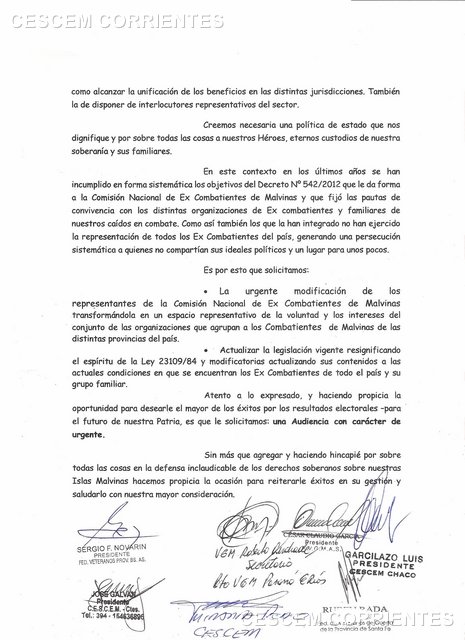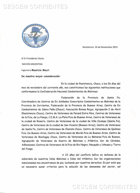 NoticiasTodas las Noticias 201511/12/2015Confederación Nacional Combatientes de MalvinasResistencia 26 de Noviembre 2015 Al Sr Presidente Electo NACION ARGENTINA Ingeniero Mauricio Macri De nuestra mayor consideración: En la ciudad de Resistencia, Chaco, a los 26 días del mes de noviembre del corriente año, nos constituimos las siguientes instituciones que conformamos la Confederación Nacional Combatientes de Malvinas: Federación de la Provincia de Santa Fe, Coordinadora de Centros de Ex Soldados Conscriptos Combatientes en Malvinas de la Provincia de Corrientes, Federación de la Provincia de Buenos Aires, Centro de Ex Combatientes de Sáenz Peña (Chaco), Asociación Boinas Rojas, Agrupación 2 de Abril (Resistencia Chaco), Centro de Veteranos de Paraná Entre Ríos, Centros de Veteranos de la Pcia. de La Pampa, C.E.M.A. La Plata Pcia de Buenos Aires, Centro de Veteranos de la ciudad de Rosario, Centro de Veteranos de la ciudad de Villa Ocampo (Santa Fe), Centro de Veteranos de la ciudad de San Vicente (Buenos Aires), Centro de Veteranos de Santa Fe, Centro de Veteranos de Charata Chaco, Centro de Veteranos de Quilmes Pcia. De Buenos Aires, Centro de Veteranos de Morón Pcia. de Buenos Aires, Centro de Veteranos de Machagay Chaco, Centro de Veteranos de La Matanza Pcia. de Buenos, Agrupación de Veteranos de Guerra de Malvinas y Atlántico Sur de Córdoba, Adhesiones: Centros de Veteranos de la Pcia. de Rio Negro, Neuquén y Ushuaia y Tierra del Fuego. A 33 años del conflicto bélico en defensa de la soberanía de nuestras Islas Malvinas e Islas del Atlántico Sur las organizaciones mencionadas nos encontramos de pie, luchando por nuestros derechos. Es por esto que es necesario aunar criterios para la solución de las demandas del sector, así como alcanzar la unificación de los beneficios en las distintas jurisdicciones. También la de disponer de interlocutores representativos del sector. Creemos necesaria una política de estado que nos dignifique y por sobre todas las cosas a nuestros Héroes, eternos custodios de nuestra soberanía y sus familiares. Es por esto que solicitamos: • La urgente modificación de los representantes de la Comisión Nacional de Ex Combatientes de Malvinas transformándola en un espacio representativo de la voluntad y los intereses del conjunto de las organizaciones que agrupan a los Combatientes de Malvinas de las distintas provincias del país. • Actualizar la legislación vigente resignificando el espíritu de la Ley 23109/84 y modificatorias actualizando sus contenidos a las actuales condiciones en que se encuentran los Ex Combatientes de todo el país y su grupo familiar. Atento a lo expresado, y haciendo propicia la oportunidad para desearle el mayor de los éxitos por los resultados electorales -para el futuro de nuestra Patria, es que le solicitamos: una Audiencia con carácter de urgente. Sin más que agregar y haciendo hincapié por sobre todas las cosas en la defensa ¡nclaudicable de los derechos soberanos sobre nuestras Islas Malvinas hacemos propicia la ocasión para reiterarle éxitos en su gestión y saludarlo con nuestra mayor consideración. Documentos:  |